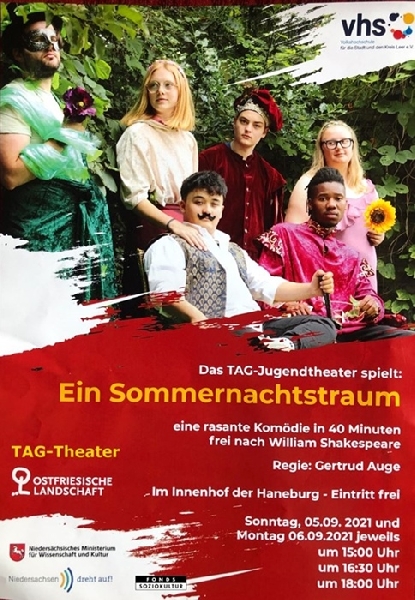 Das TAG-Jugendtheater der Nationen präsentiert eine amüsante Kurzfassung des Sommernachtstraums von William Shakespeare zum interkulturellen Fest in Leer bei der VHS Leer, Haneburg, Open Air.